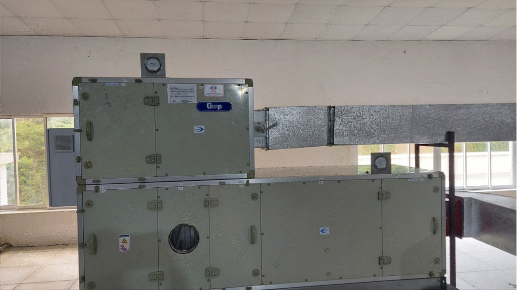 An Air Handling Unit (often abbreviated to AHU), is a device used to condition and circulate air as part of a heating, ventilation, and cooling (HVAC) system. An AHU is usually a large double skin metal box containing a blower, heating and cooling elements filter(s) racks or chambers, sound attenuators, and dampers. AHU will be connected to a ductwork ventilation system that distributes the conditioned air through the building and returns itto the AHU.
